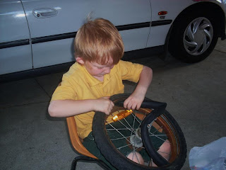 Then it was time to change the frount tyre, and we also replaced one of the peddles that had broken off. And on with a cool bike stand..... cool stuff mate. And then it was time to give it a go, he was so on a high..... he's first time without training wheels, and he was going to give it all he had. I'll tell you what i wish i had a video in my hand at the time, he kicked off went left... then right... then left and straight into the fence! ha,ha,ha funniest thing i've seen in ages (th